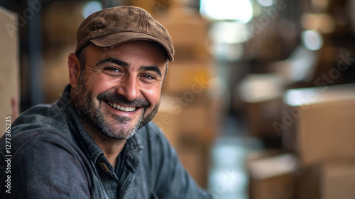 Portrait of a smiling delivery man in a warehouse with boxes, looking at the camera and showing a big smile while standing against a blurred background, generative AI