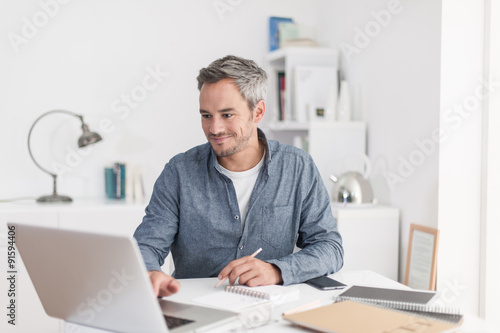 Portrait of a smiling grey hair man with beard, working at home