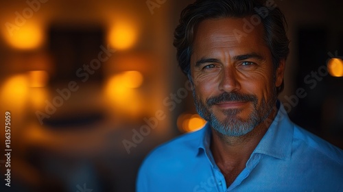 Portrait of a smiling middle-aged man in a dimly lit room.