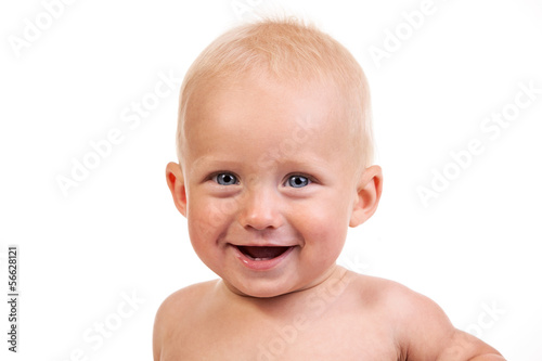Portrait of a smiling nine-month old boy over white background