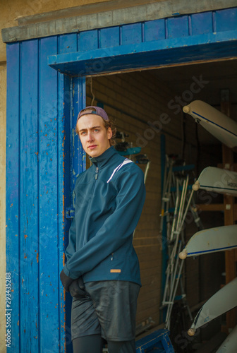 Portrait of a sporty young man outside a boathouse
