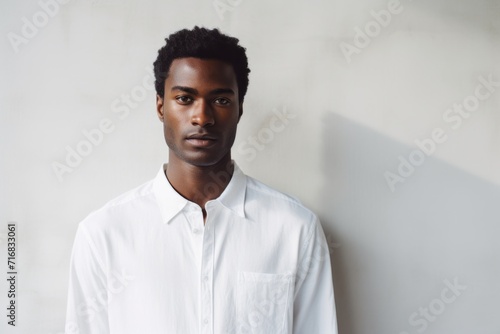 Portrait of a tender afro-american man in his 20s wearing a simple cotton shirt against a minimalist or empty room background. AI Generation