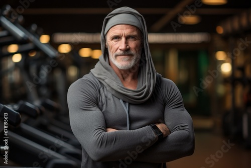 Portrait of a tender man in his 50s wearing a versatile buff against a dynamic fitness gym background. AI Generation