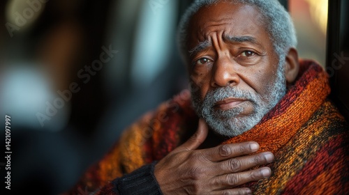 Portrait of a thoughtful elderly African American man wrapped in a warm blanket, conveying a sense of contemplation and quiet strength.