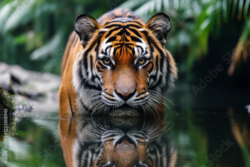 Portrait of a tiger standing on the bank of a calm river. Tiger standing on the surface of the water looking at the camera.