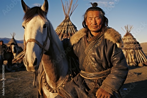 Portrait of a traditional nomad in ethnic attire beside a horse, with yurts in background during golden hour