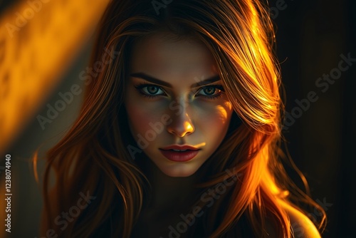 Portrait of a woman illuminated with warm golden light, showcasing her expressive stare and radiant hair, creating a mood of intensity and elegance.