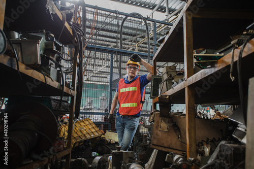 Portrait of a worker in a factory. Portrait of industrial worker indoors in factory. Young technician with hard hat.