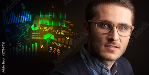 Portrait of a young businessman with colorful charts and graphs next to him on a dark background