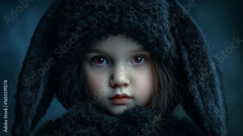 Portrait of a Young Girl in a Dark Hooded Costume with Red Eyes