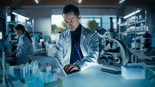 Portrait of a Young Graduate Student Working in a Laboratory, Using Laptop, Writing Down Research Data on a Computer. Multiethnic Biotechnology Specialist Using Modern Tools