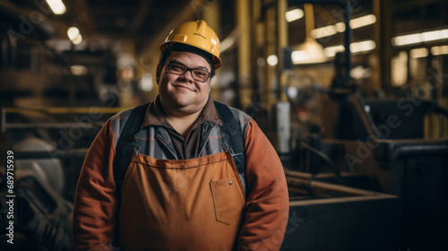 Portrait of a young man with Down syndrome working in a factory. A smiling man with mental retardation wearing a hard hat at an industrial enterprise. Social integration concept.