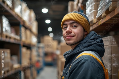 Portrait of a young man with Down syndrome working in a warehouse, emphasizing inclusivity in the workplace and supporting workers with disabilities, Generative AI