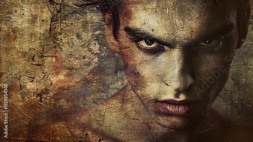 Portrait of a Young Man with Intense Expression Against Grunge Backdrop. Concept of Masculine Strength, Edgy Style, Unique Art, and Raw Emotion