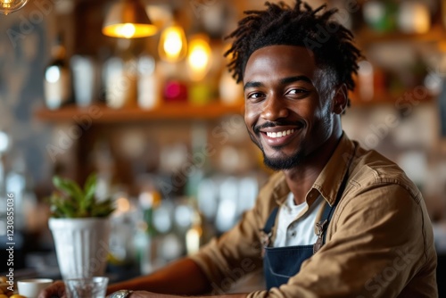 portrait of a young smiling Ugandan male bartender against blurred bar background