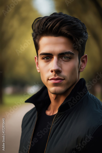 Portrait of a young stylish man wearing a thin jacket and standing in a park, created with generative A.I. technology