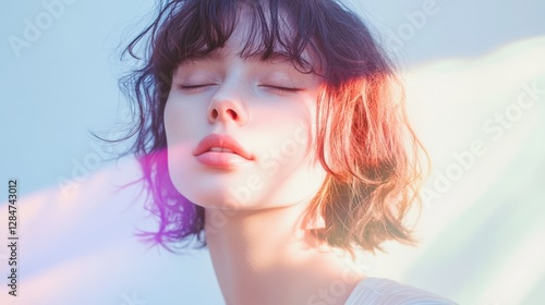 Portrait of a young woman illuminated by a ray of soft multi-colored light. Concept of inner peace and spiritual awakening. Calm aesthetics, minimalism with a sense of cosmic wonder.
