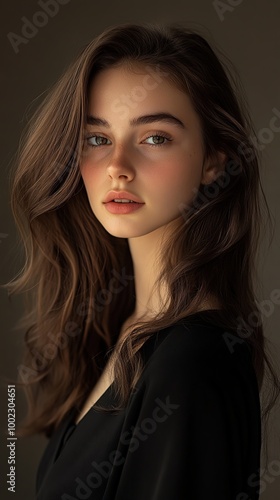 Portrait of a young woman with fine brown hair standing straight and looking gracefully at the camera