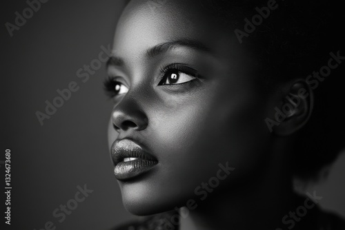 Portrait of a young woman with smooth skin looking up in black and white. Smooth makeup reflects the light on face.