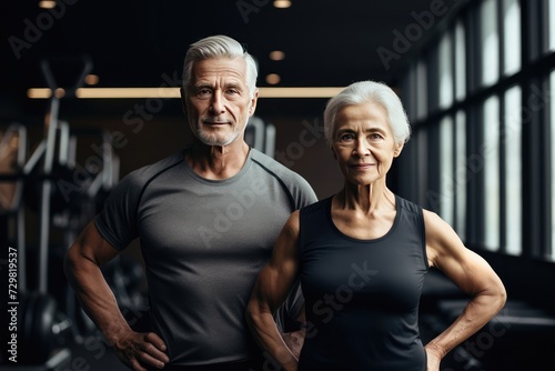 Portrait of active senior happy smiling couple family standing in gym after doing workout.