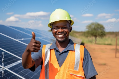 Portrait of african american man in helmet on field with solar panels showing thumb up. Concept of eco energy and service work