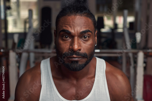 portrait of an attractive sports man Afro, who stands in the gym in a white T-shirt and looks directly into the camera. High quality photo