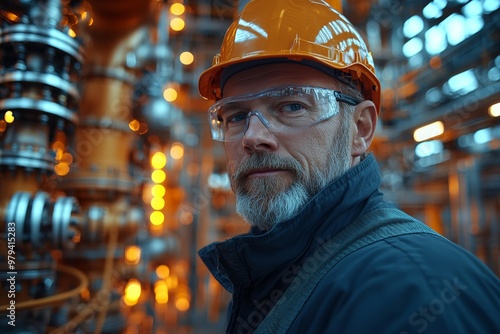 Portrait of an elderly worker in a yellow hard hat, standing in front of stacked logs, symbolizing experience, hard work, and the logging industry.