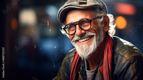 Portrait of an older hipster exuding style, wearing a cap and glasses. Concept: Positive attitude at any age.