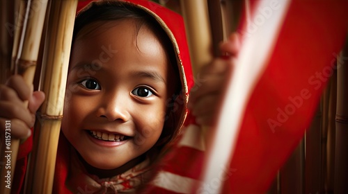 Portrait of an smiling young asian boy with indonesia flag and colors celebrating the independence day.