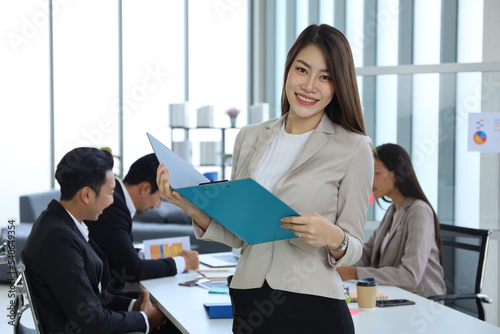 Portrait of Asian businesswoman standing and using paper document with business people meeting and talking in the room background