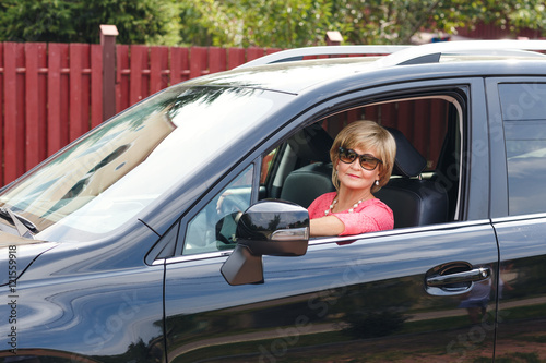 Portrait of attractive well-dressed senior woman driving a car