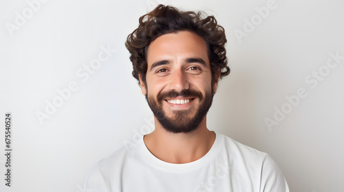 Portrait of authentic happy man without makeup, smiling at camera, standing cute against white background