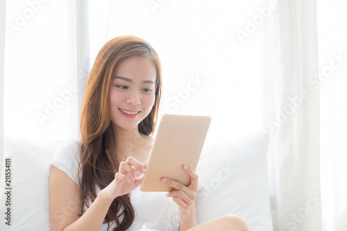 Portrait of beautiful asian young woman with holding and reading digital tablet computer with leisure, girl using tablet with relax at bedroom, lifestyle and communication concept.
