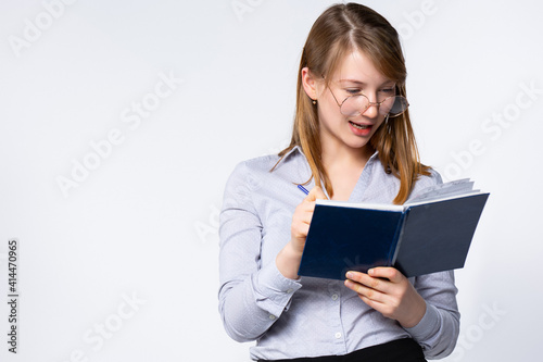 Portrait of beautiful young teacher looking into book on gray background, side space for text