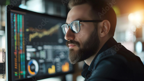 portrait of businessman or investor looking at the monitor screen financial dashborad, stock and currency market chart, focus on working