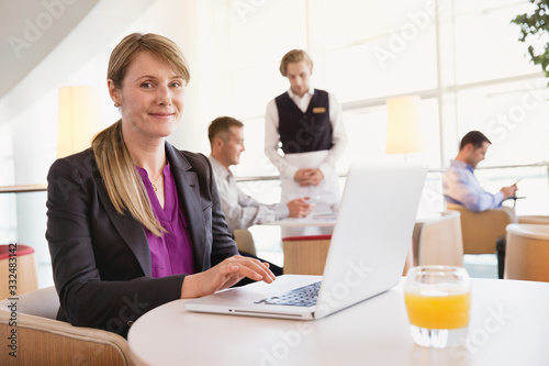 Portrait of businesswoman using laptop while people in background.