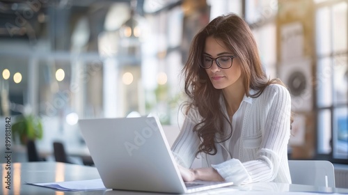 Portrait of businesswoman with laptop writes on a document at her office AI generated