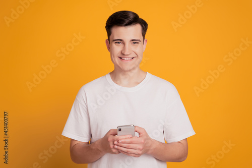 Portrait of cheerful guy hold smartphone beaming shiny smile on yellow background