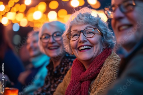 Portrait of cheerful senior friends enjoying an outdoor night concert in the city