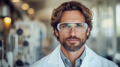 portrait of confident scientist in white lab coat with protective eyewear surrounded by blurred laboratory equipment