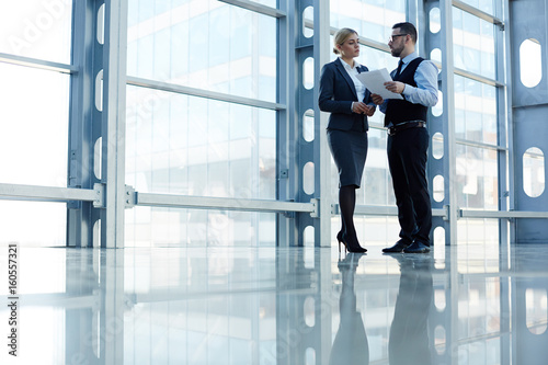 Portrait of contemporary business people, man and woman, discussing work standing in hall of modern office building, copy, space