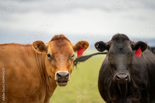 Portrait of Cows in a field grazing. Regenerative agriculture farm storing co2 in the soil with carbon sequestration in springtime