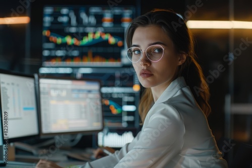 Portrait of crypto trader at the office. Successful female trader in formalwear working in office, looking at camera in front of laptop screen, checking global currency index on fund exchange