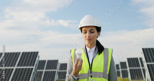 Portrait of electrician engineer in safety helmet and uniform near photovoltaic solar panels. Female engineer holding bulb on solar panel background.