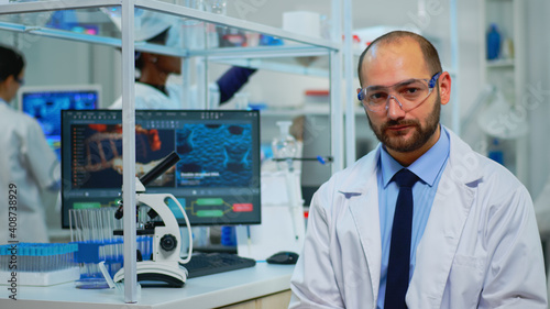 Portrait of exhausted chemist looking at camera in modern equipped lab. Multiethnic team examining virus evolution using high tech and chemistry tools for scientific research, vaccine development.