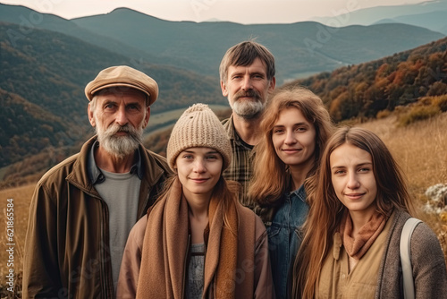 Portrait of family standing on hillside with grass in mountains, created with Generative AI.