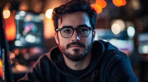 Portrait of Focused Software Developer Wearing Glasses Working on Laptop in Dark High-Tech Office Environment