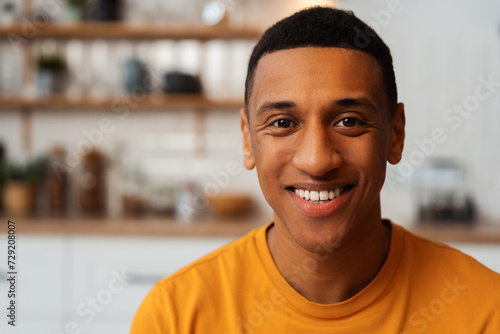 Portrait of handsome authentic smiling African American man wearing yellow t shirt, looking at camera on kitchen, at home in apartment, copy space. Advertisement concept