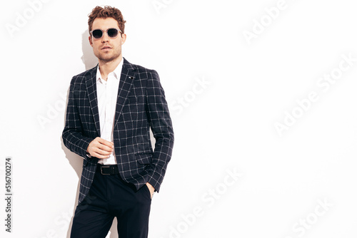 Portrait of handsome confident stylish hipster lambersexual model. Sexy modern man dressed in black elegant suit. Fashion male posing in studio near white wall. In sunglasses