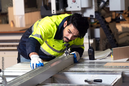 Portrait of handsome engineer man in the process of inspecting equipment and collecting production data analysing efficiency in the wood factory. Manufacturing concept.
